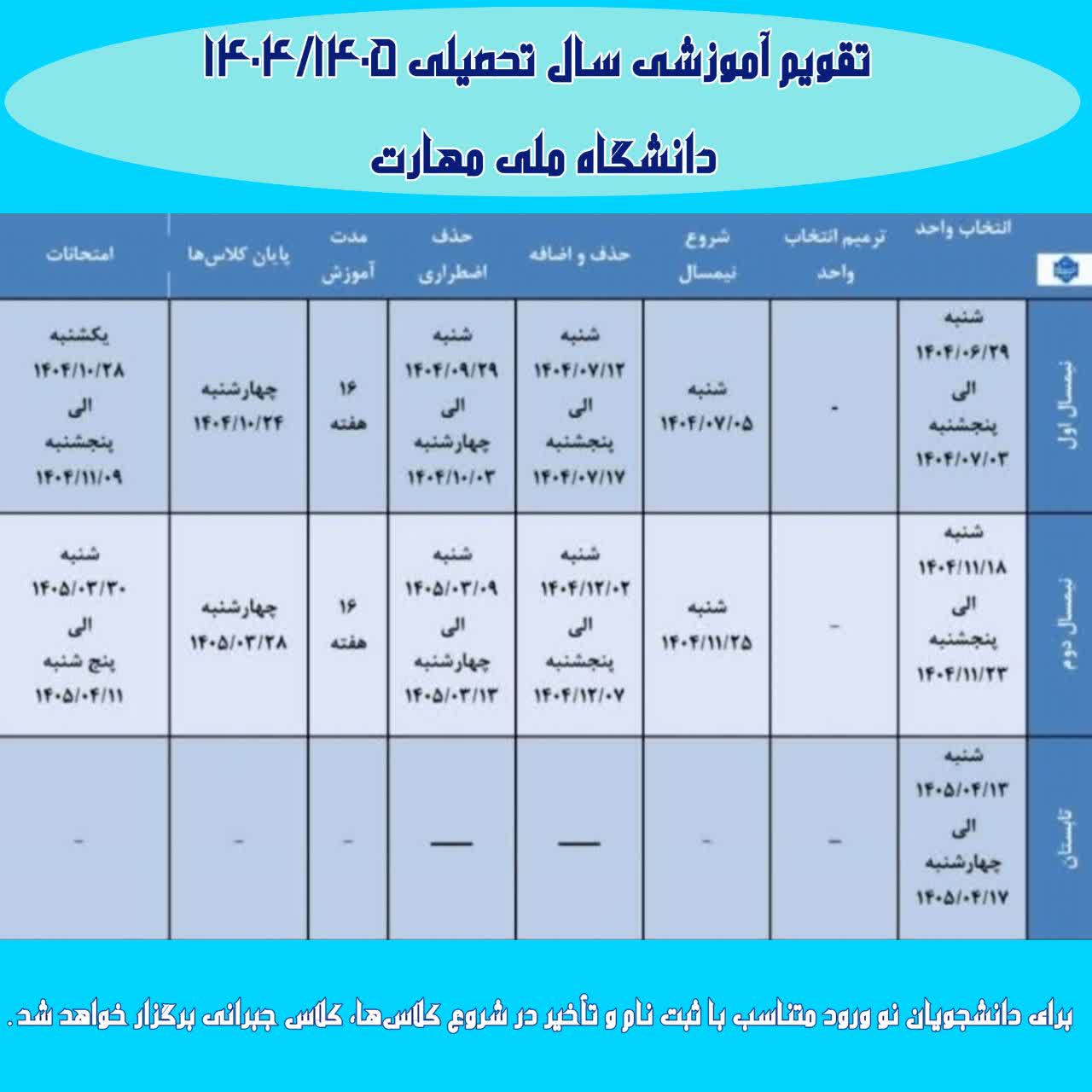 تقویم آموزشی سال تحصیلی ۱۴۰۴/۱۴۰۵ دانشگاه ملی مهارت
