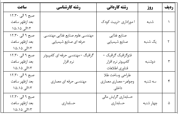 با توجه به جدول زیر در روز ها و ساعت های مشخص شده طبق جدول ضمیمه،جهت دریافت کارت دانشجویی مراجعه نمایید