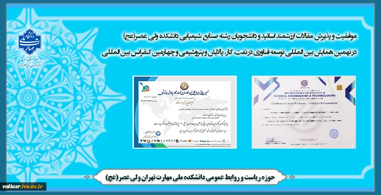 موفقیت و پذیرش مقالات ارزشمند اساتید و دانشجویان رشته صنایع شیمیایی دانشکده ولی عصر(عج) در نهمین همایش بین المللی توسعه فناوری در نفت، گاز، پالایش و پتروشیمی و چهارمین کنفرانس بین المللی 2