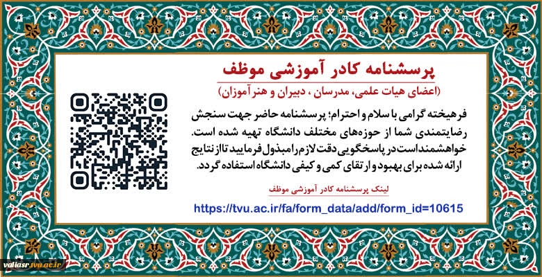امتیاز دهید : پرسشنامه کادر آموزشی موظف (اعضای هیات علمی، مدرسان ، دبیران و هنرآموزان) 2 یکشنبه 31 فروردین 1404 ساعت 13:45
