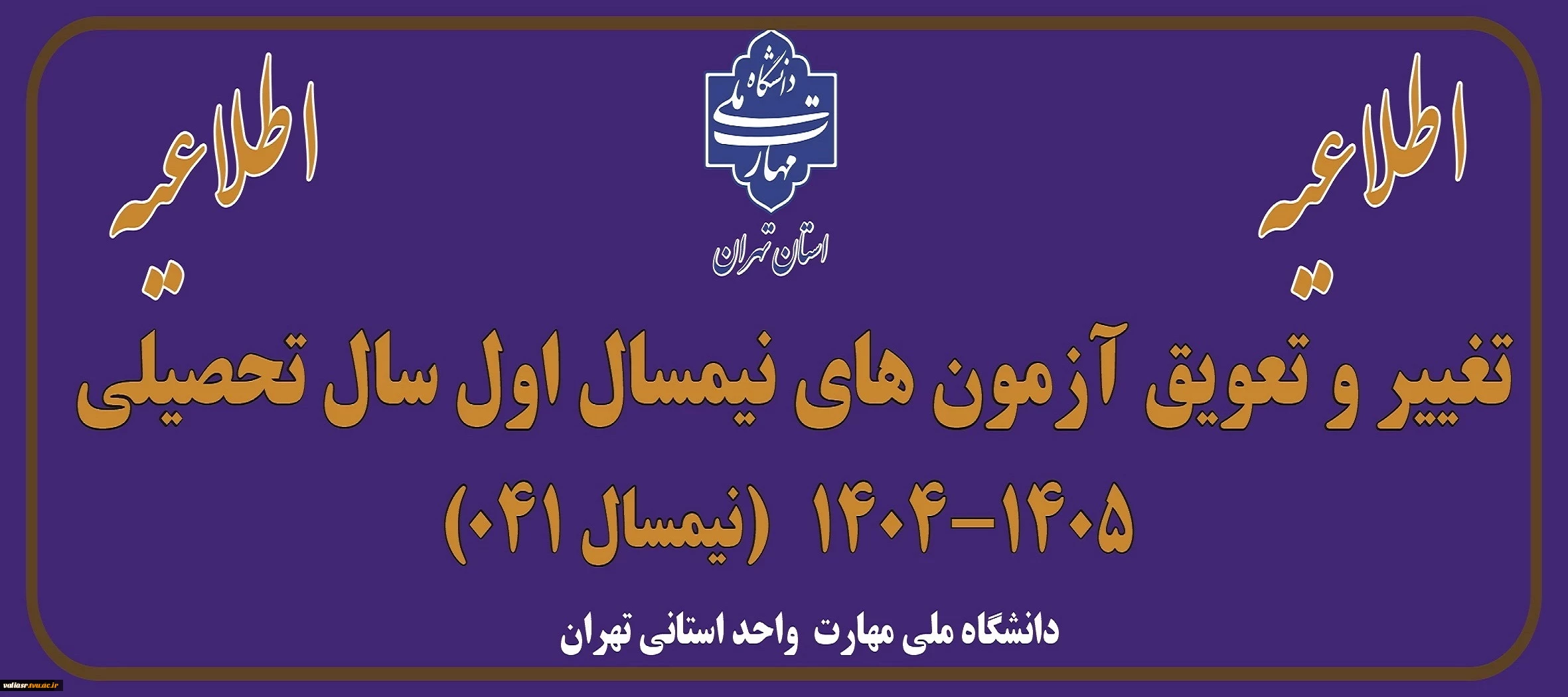 امتیاز دهید : اطلاعیه تغییر و تعویق آزمون های نیمسال اول سال تحصیلی 1405-1404(041) 2 یکشنبه 21 دی 1404 ساعت 9:15
