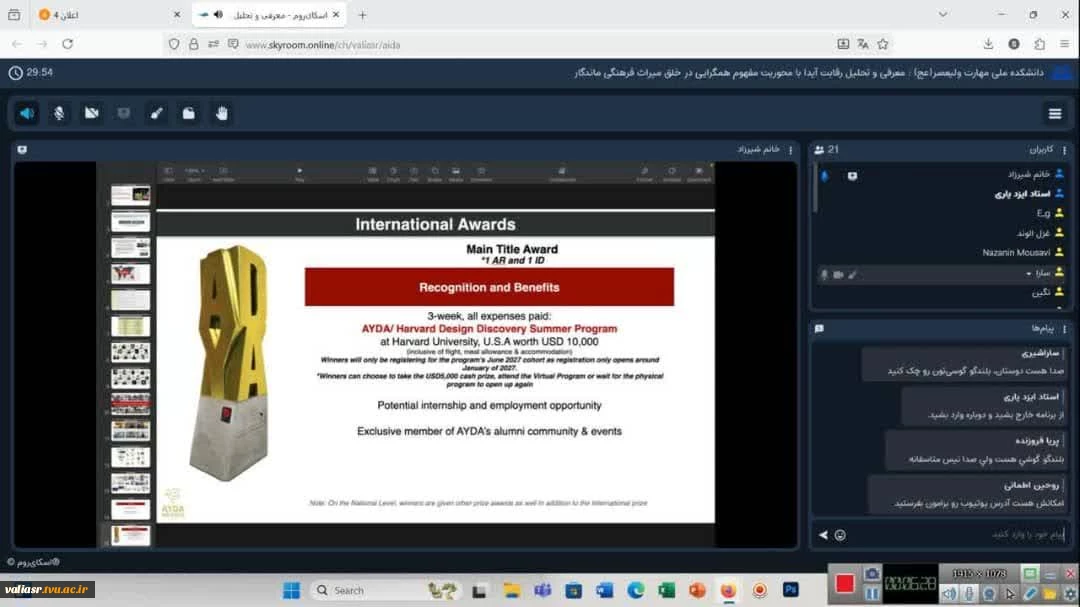 امتیاز دهید : برگزاری وبینار تخصصی-آموزشی آشنایی با مسابقه دانشجویی بین المللی با موضوع: «معرفی و تحلیل رقابت آیدا، با محوریت مفهوم همگرایی در خلق میراث فرهنگی ماندگار» در دانشکده ولی عصر(عج) 3 سهشنبه 16 دی 1404 ساعت 13:28